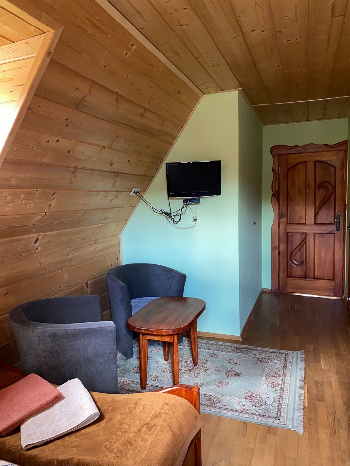 Pokój dwuosobowy umożliwia konsumpcję śniadania przy przepięknej panoramie Bieszczadów. Taki widok to sposób na relaks po udanym zdobywaniu szczytów.
